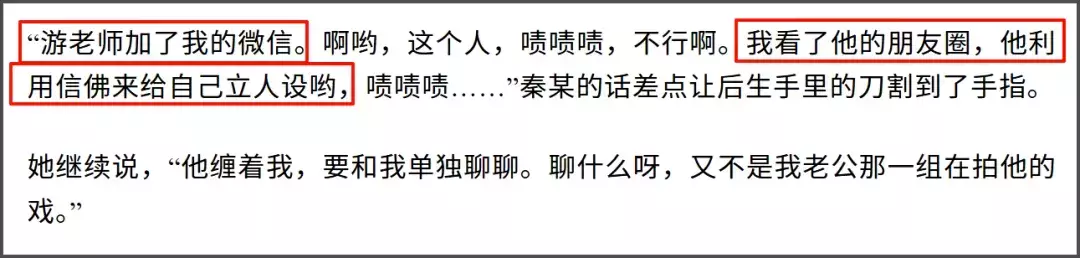 除了王家卫,秦雯还蛐蛐游本昌,游诚实主动加了她的关连形势,成果秦雯说看了游本昌的一又友圈,“他运用信佛来立东说念主设”,还不耐性游本昌缠着她聊剧情,说不是她老公认真拍游本昌——啊?演员和编剧聊聊脚本有什么问题吗?