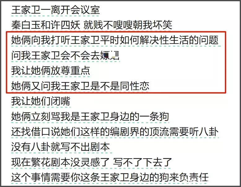 古二依然爆料过,王家卫聊完脚本走了,秦雯就和古二八卦王家卫私生计,问王家卫情感景象,古二让她闭嘴,她又骂古二是狗,说我方要听八卦才能有灵感写脚本。